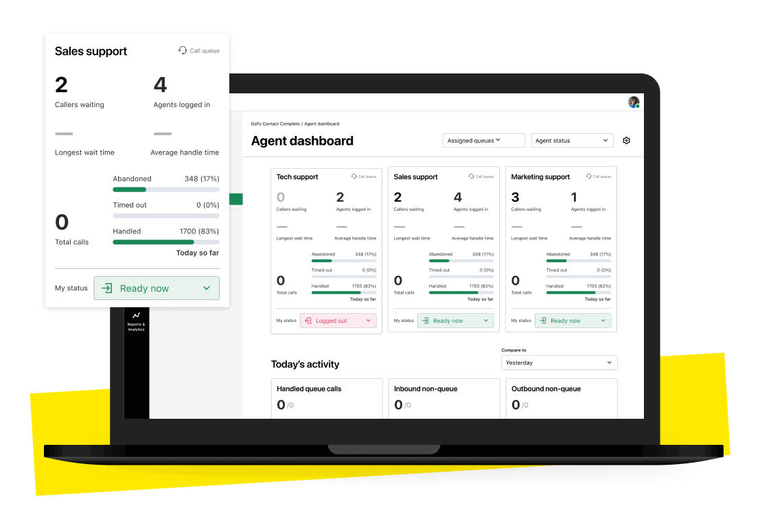 Os recursos avançados de análise e geração de relatórios em tempo real do GoTo Connect promovem melhorias contínuas no desempenho. Tenha uma visão geral da situação ou entre no detalhe do desempenho individual com visualizações por equipe e volume de chamadas. Os painéis de equipe potencializam o crescimento com visualizações direcionadas para a equipe gerenciar o desempenho e os KPIs.
