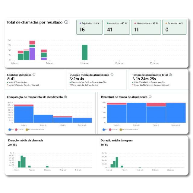 O sistema também conta com relatórios intuitivos para acompanhar o desempenho da equipe e os indicadores das ligações