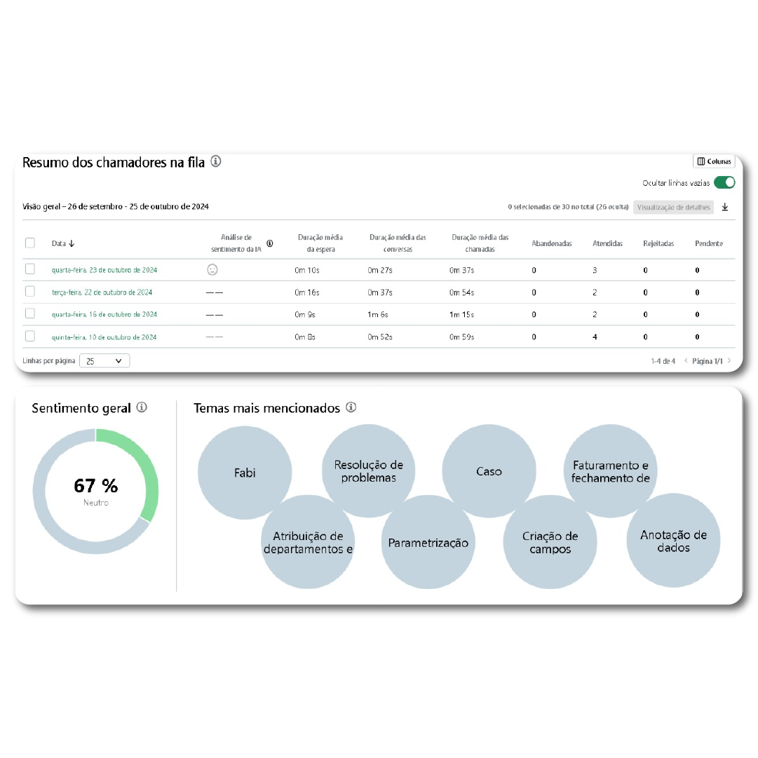 Mergulhe na jornada de cada chamada, do início ao fim. Cada conversa telefônica é capturada em painéis personalizáveis e intuitivos, permitindo que sua empresa identifique e atue proativamente sobre os pontos fracos dos clientes, guiando a tomada de decisões comerciais estratégicas.
